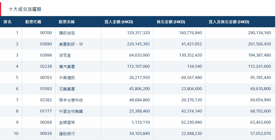 港股通(深)十大活跃成交股