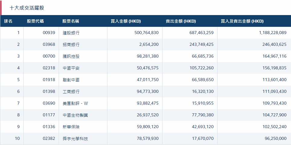 港股通(沪)十大活跃成交股