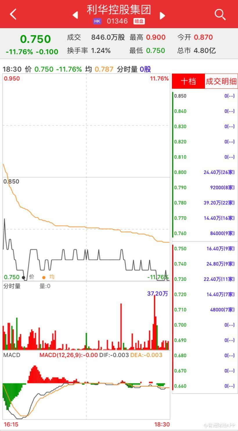智通财经APP获悉,利华控股集团(01346)将于11月13日挂牌,截至收盘,辉立证券暗盘交易显示其报价0.75港元,较招股价0.85港元跌11.765%。每手4000股,不计手续费,每手亏400港元。
