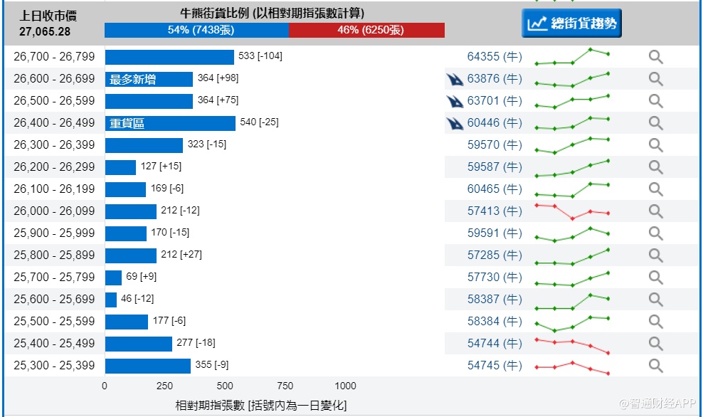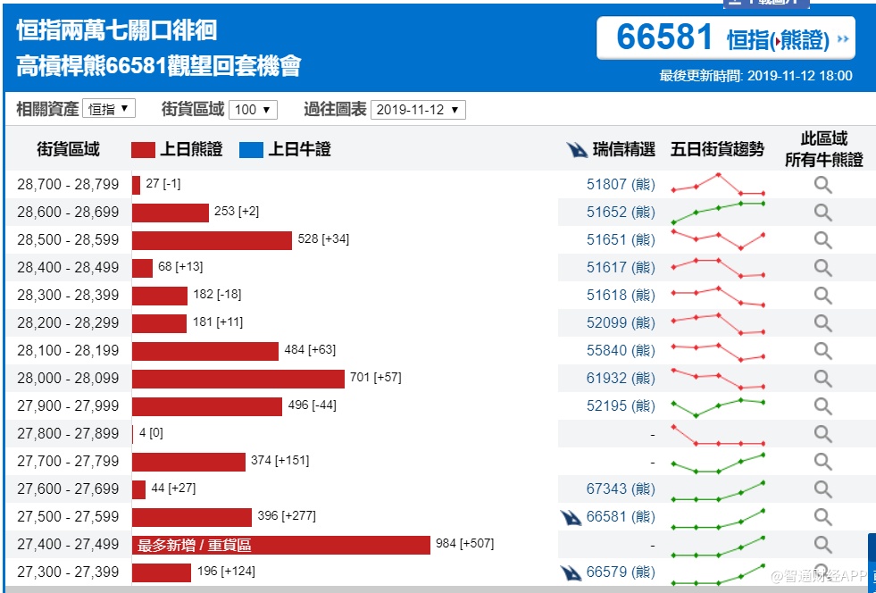 智通财经APP获悉,截至11月12日,恒指最新的牛熊街货比例54:46。瑞信恒指牛熊证街货分布图中的数据显示,熊证街货重货区在27400-27499区间,该区间最新熊证数量为984张,较上一交易日增加507张,最多新增也此区间。牛证街货重货区在26400-26499区间,该区间最新熊证数量为540张,较上一交易日减少25张,最多新增重货区在26600-26699区间,该区间最新熊证数量为364张,较上一交易日增加98张。