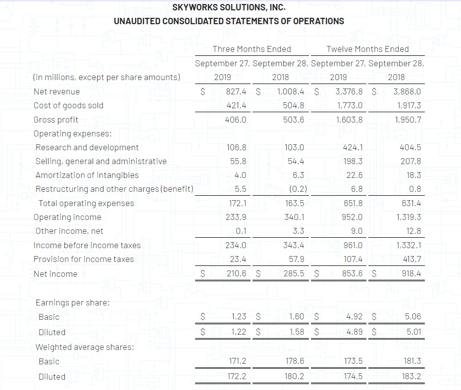 财报显示,思迅佳本季度总收入为8.27亿美元,同比降低18%。全年总收入为33.7亿美元,同比降低13%。思佳迅本季度的净利润为2.1亿美元,同比降低26%。摊薄后每股收益为1.22美元。全年净利润为8.5亿美元,同比降低8%。摊薄后每股收益为4.89美元。