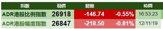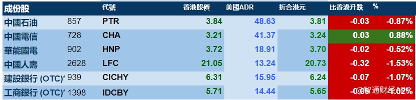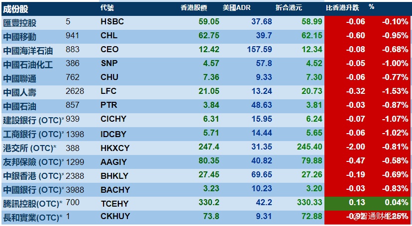 智通财经APP获悉,周二纳指创收盘新高,但港股ADR指数却下跌,按比例计算,收报26918点,跌146.74点或0.55%。大型蓝筹下跌为主,汇丰控股收报58.99元,较港收市涨跌0.06元;腾讯控股收报330.33元,较港收市涨0.13元。
