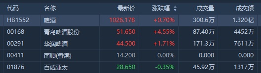 截至发稿,青岛啤酒(00168)涨4.86%,报51.8港元;华润啤酒(00291)涨1.94%,报44.6港元;唯有百威亚太(01876)跌0.17%,报28.7港元。