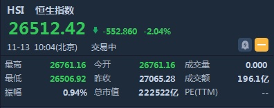 智通财经APP获悉,恒生指数早盘急挫逾550点,跌超2%,一度低见26506.92点,跌破所有均线,蓝筹股全线下挫。截至10时04分,跌2.04%,报26512.42点,成交额196.1亿。