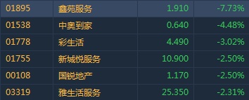 智通财经APP获悉,物业管理板块整体高位回吐。截至15时46分,鑫苑服务(01895)跌7.73%,报价1.91港元,中奥到家(01538)跌4.48%,新城悦服务(01755)跌2.5%,雅生活服务(03319)跌2.31%。