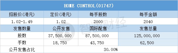 智通财经APP获悉,11月13日,HOME CONTROL(01747)配售结束。配售招股价区间为1.02-1.49港元,最终定价1.02港元,每手2040港元。