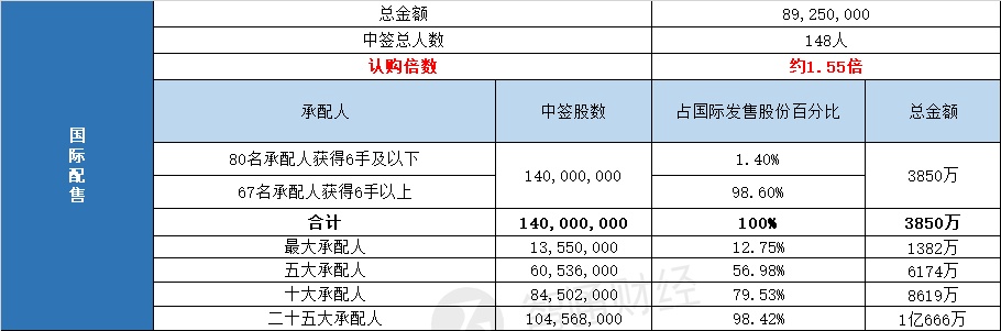 国际配售申购人数未公布,认购倍数约1.55倍。