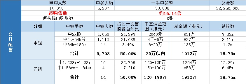 其中,公开配售申购人数10398,一手中签率30%,超购倍数约16.14倍。