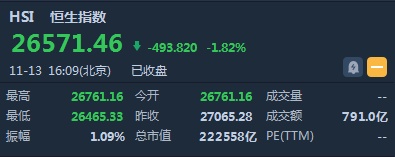 智通财经APP获悉,恒指早盘低开304.12点或1.12%,报26761.16点。截至收盘,恒生指数跌493.82点或1.82%,报26571.46点,全日成交额达791.05亿。国企指数跌1.61%,报10519.12点,红筹指数跌1.47%,报4276.52点。