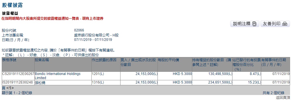智通财经APP获悉,联交所最新资料显示,11月7日,Bondic International减持盛京银行(02066)