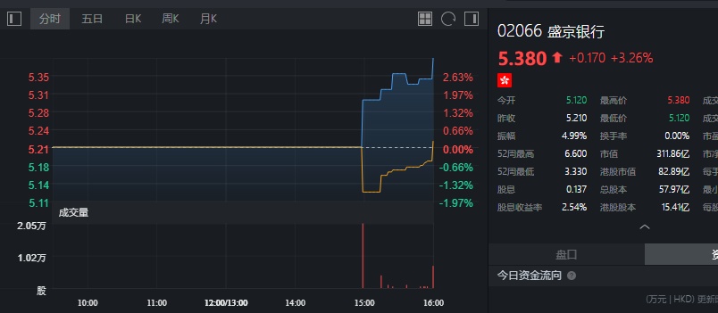截至今日收盘,盛京银行涨3.26%,报5.38港元。