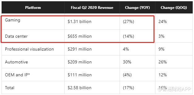 回顾第二季度,英伟达公布营收为25.8亿美元,同比下滑17%,主要是受数据中心和GPU业务疲软的影响;调整后每股盈利1.24美元,同比下滑36%。