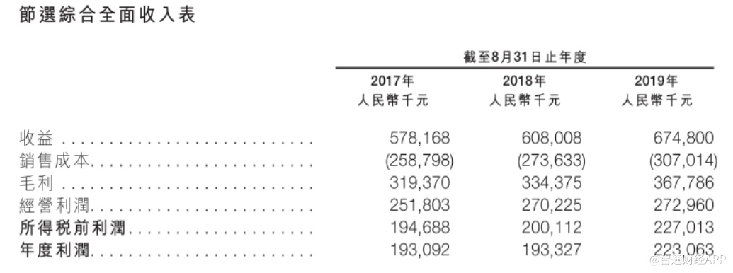 招股书显示,2017年、2018年及2019年截止8月31日止年度,华立大学的收益分别为5.78亿元、6.08亿元及6.75亿元;毛利分别为3.19亿元、3.34亿元及3.68亿元,毛利率分别为55.2%、55.0%及54.5%;净利润分别为1.93亿元、1.93亿元及2.23亿元,净利率分别为33.4%、31.8%及33.1%。![]()