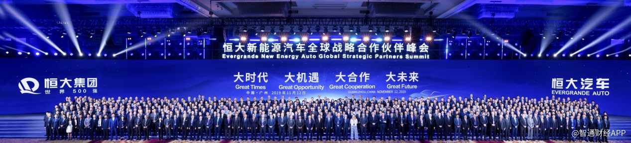 11月12日,恒大新能源汽车全球战略合作伙伴峰会在广州召开,广州市市长温国辉、恒大集团董事局主席许家印,德国FEV集团全球CEO Stefan Pischinger、德国EDAG集团全球CEO Cosimo De Carlo、西班牙海斯坦普集团全球CEO Francisco López Peña、意大利宾法集团全球CEO Silvio Pietro Angori、德国博世集团新兴市场全球CEO Stefan Seiberth等206家全球汽车产业工程技术、造型设计、制造设备、零部件、电池、电机等领域龙头企业的CEO及高管1100多人出席峰会。