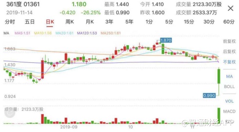 智通财经APP注意到,11月14日,361度股价盘中突然“跳水”,跌幅一度接近40%,股价最低下探至0.99港元,直接“成仙”。