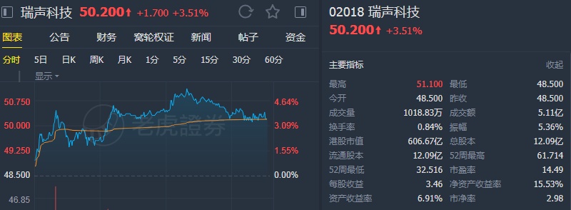 该行表示,预计瑞声于2019年及2020年净收益预测各为20.39亿及32.01亿元人民币,分别同比下滑46%及上升57%。重申对瑞声“买入”评级及目标价56港元。
