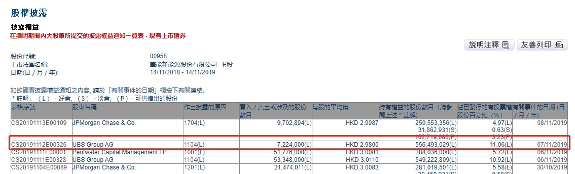 智通财经APP获悉,联交所最新资料显示,11月7日,瑞银增持华能新能源(00958)722.4万股,每股作价2.98港元,涉及总金额约为2152.75万港元。增持后最新持股数目约为5.56亿股,最新持股比例为11.06%。