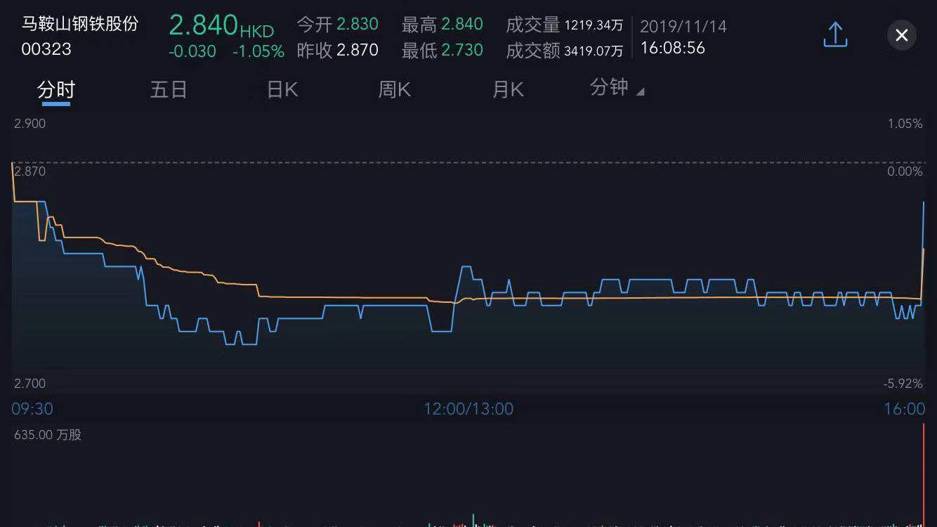 截至今日收盘,马钢股份(00323)跌1.05%,报2.84港元。
