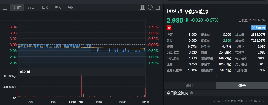 截至今日收盘,华能新能源跌0.67%,报2.98港元。