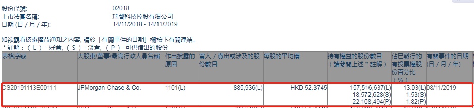 智通财经APP获悉,联交所最新资料显示,11月8日,摩根大通增持瑞声科技(02018)88.5936万股,每股作价52.3745港元,总金额约为4640.05万港元。增持后最新持股数目约为1.58亿股,最新持股比例为13.03%。
