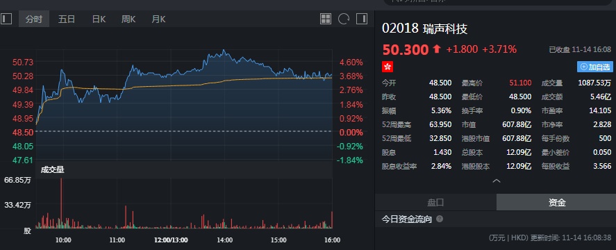 截至今日收盘,瑞声科技涨3.71%,报50.30港元。
