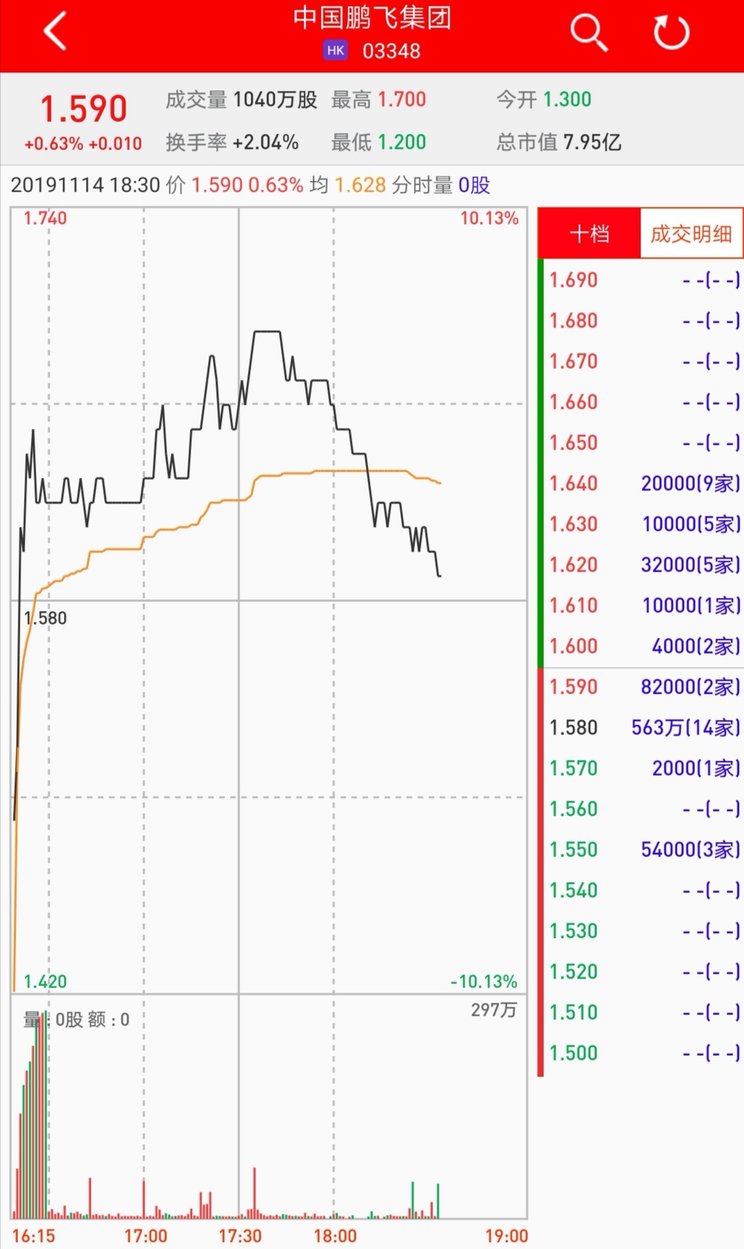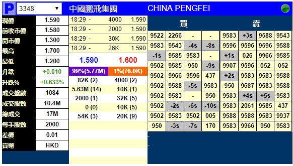 智通财经APP获悉,中国鹏飞集团(03348)将于11月15日挂牌,截至收盘,辉立证券暗盘交易显示其报价1.59港元,较招股价1.58港元升0.633%。每手2000股,不计手续费,每手赚20港元。