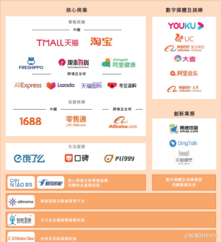 阿里巴巴的核心商业包括淘宝天猫在内的零售商业,1688.com和零售通等批发商业,菜鸟网络的物流商业以及饿了么、口碑组成生活服务商业;阿里的云计算业务则是以阿里云业务为主;在数字媒体及娱乐业务方面,阿里巴巴的业务范围主要集中在2大分发平台:优酷和UC浏览器,以及娱乐产业综合平台阿里影业;在创新业务上,阿里的发力点则着重在高德地图、钉钉和天猫精灵上。