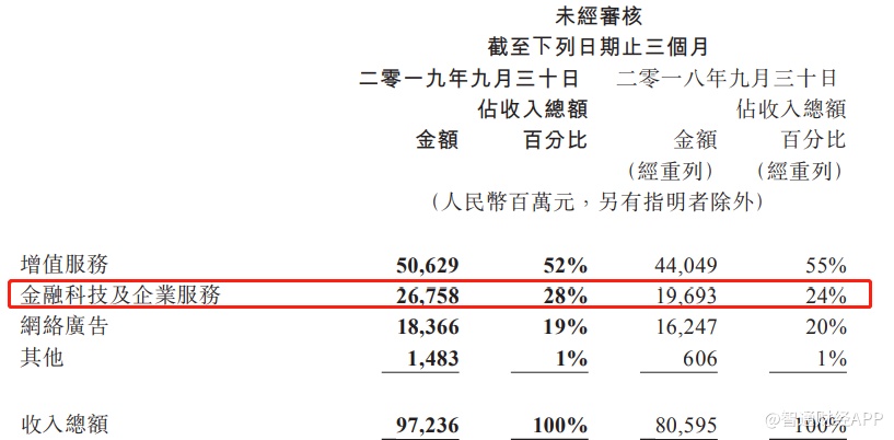 从四项业务的增长情况来看,金融科技及企业服务一支独秀。在报告期内,该业务的收入增长35.88%至267.58亿元。得益于规模的快速增长,金融科技及企业服务在总收入中的比例从去年同期的24%提升至28%。