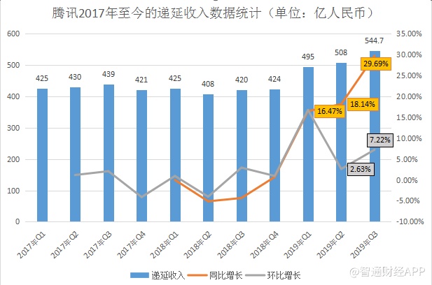 事实上,腾讯游戏在该季度的实际表现比收入数字所体现的要更优秀些,这体现在了递延收入上。智通财经APP发现,自2018年Q4开始,腾讯游戏的递延收入已重回增长轨道,而在这次报告期内,递延收入再创新高至544.7亿元,同比增长近30%,环比增长7.22%。