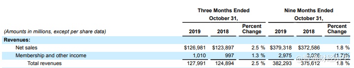 根据财报,三季度,沃尔玛总营收同比增2.5%至1279.9亿美元,市场预期1286亿美元。排除货币影响,总营收同比增3.3%至1290亿美元。其中,净销售额1269.8亿美元,同比增2.5%;会员及其他收入为10.1亿美元,同比增1.3%。
