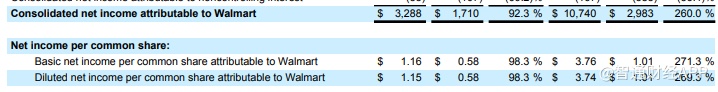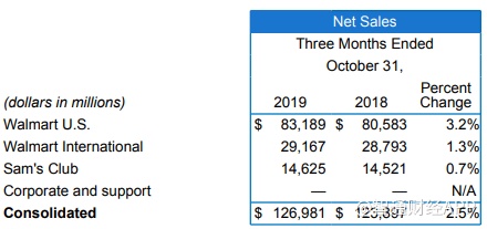 山姆会员店(沃尔玛旗下的高端会员制商店)净销售额146.3亿美元,同比增0.7%。