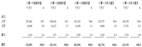 于2016财年、2017财年、2018财年及2019年首八个月,提供空运出口服务应占总收益分别约为2.979亿港元、4.004亿港元、4.472亿港元及1.948亿港元,分别占同期公司总收益约89.7%、94.1%、96.6%及90.9%。