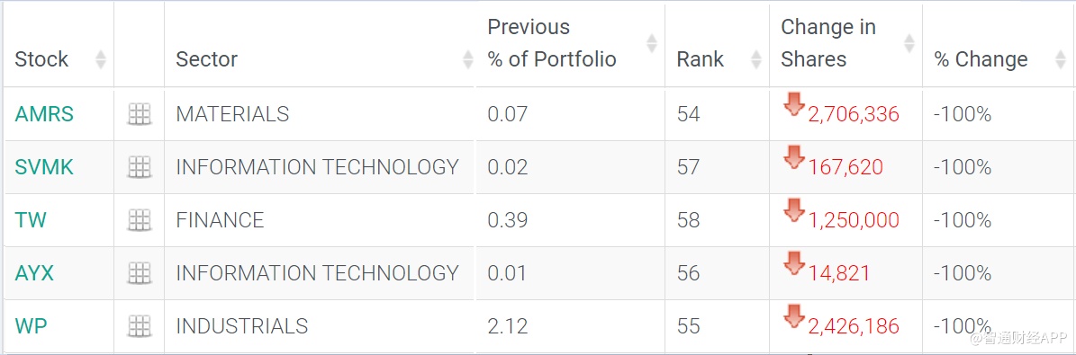 清仓的5间公司包括阿米瑞斯公司(AMRS.US), SurveyMonkey(SVMK.US), Tradeweb