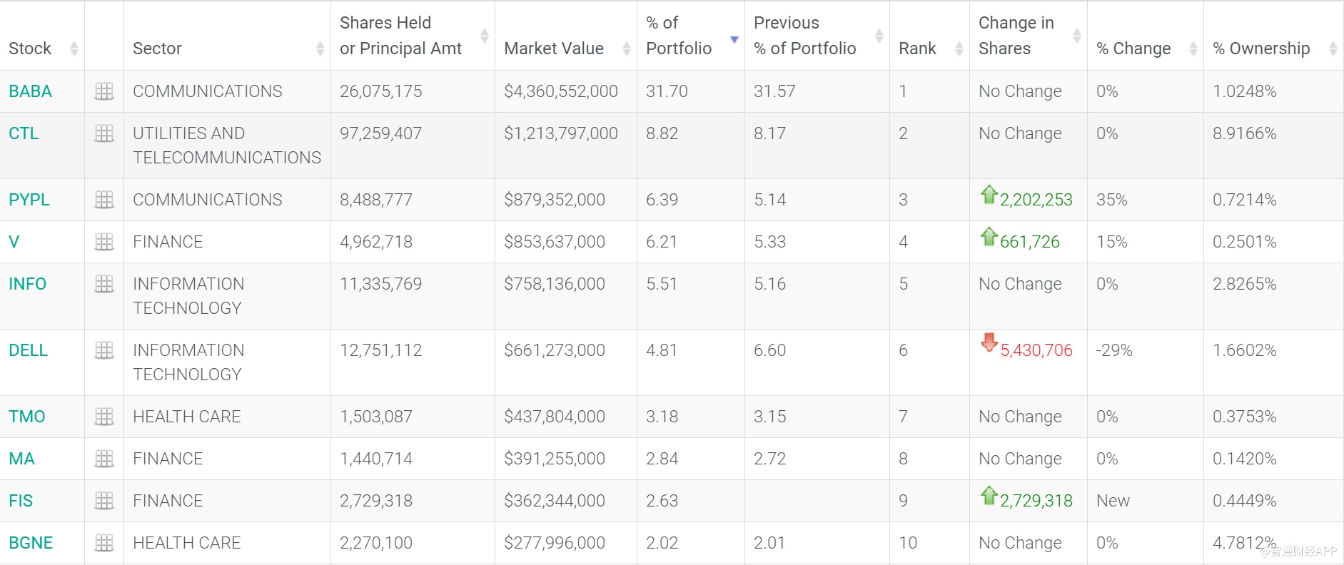 阿里巴巴(BABA.US)仍是其最大重仓股,持有股份数为26075175股,在三季度无增减持变化,占比31.57%。而获增持的PayPal一跃成为淡马锡重仓股的第三位,占比6.39%;VISA排在第四,占比6.21%。Dell Technologies Inc虽仍在十大重仓股内,但排名跌至第6,占比4.81%。