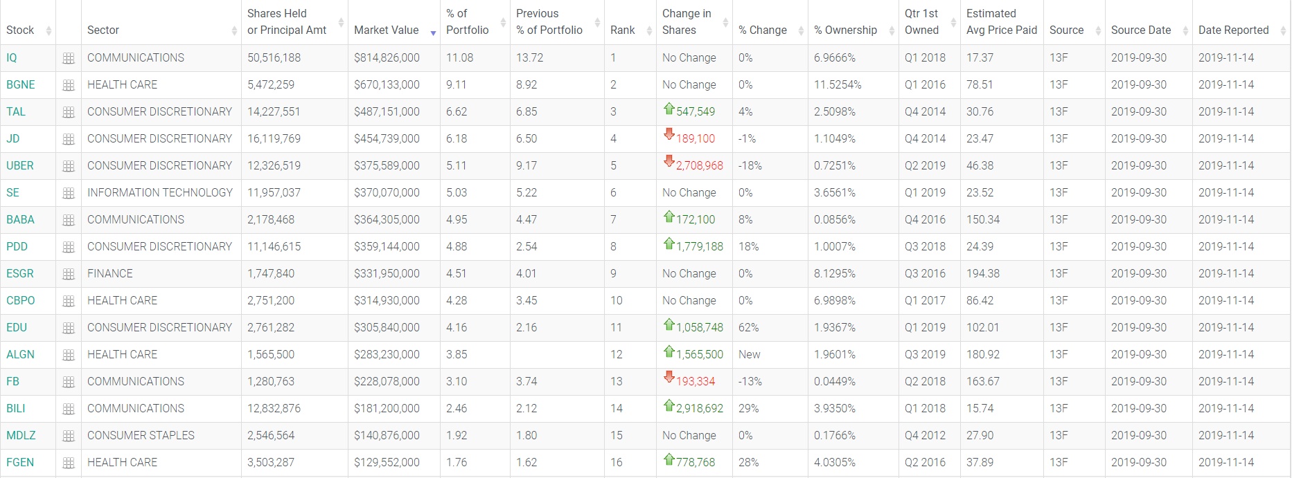截至2019年9月底,高瓴资本在美国二级市场的前五大重仓股分别是:爱奇艺、百济神州、好未来、京东、UBER,持有市值分别为8.1亿美元、6.7亿美元、4.8亿美元、4.5亿美元和3.7亿美元。此外,阿里巴巴、新东方的持有市值继续保持在3亿美元以上。