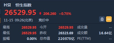 智通财经APP获悉,恒生指数开盘高开206.26点或0.78%,报26529.95点。国企指数涨0.9%,报10521.2点。红筹指数涨0.81%,报4273.38点。大市盘前成交16.65亿港元。
