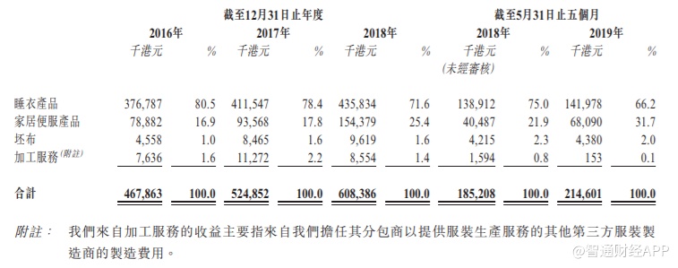该公司的服装产品可分为以下主要类别:(i)睡衣产品;及(ii)家居便服产品。于业绩记录期间,来自销售睡衣产品的收益约为376.8百万港元、411.5百万港元、435.8百万港元及 142.0百万港元,分别占我们总收益约80.5%、78.4%、71.6%及66.2%。来自销售家居便服产品的收益约为78.9百万港元、93.6百万港元、154.4百万港元及68.1百万港元,分别占我们总收益约16.9%、17.8%、25.4%及31.7%。公司的业务及经营业绩受季节性波动影响,冬季向客户销售产品产生的收益通常较高。
