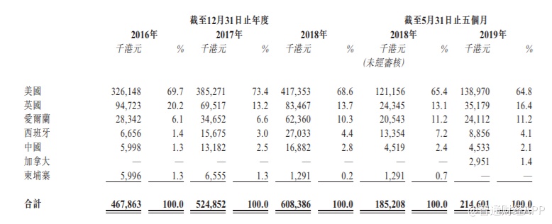 捷隆控股主要向总部设于美国、英国、爱尔兰、西班牙及加拿大的服装零售品牌客户销售睡衣及家居便服产品,该公司收入主要来自美国及英国,于2016至2018年度及2019年前5个月,来自美国收入占比约69.7%、73.4%、68.6%及64.8%,来自英国的收入占比约20.2%、13.2%、13.7%及16.4%。