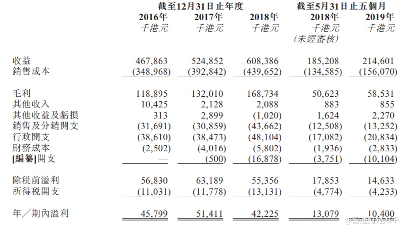 招股书显示,于2016至2018年度及2019年前5个月,该公司收益分别约4.68亿港元、5.25亿港元、6.08亿港元及2.15亿港元;毛利分别约为1.19亿港元、1.32亿港元、1.69亿港元及5853.1万港元,毛利率分别约为25.4%、25.2%、27.7%及27.3%;净利分别约为4579.9万港元、5141.1万港元、4222.5万港元及1040万港元。