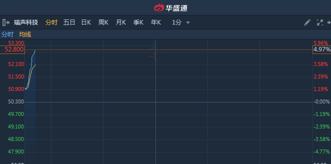 智通财经APP获悉,瑞声科技(02018)绩后获多家大行唱好,涨势延续,早盘急升逾5%,突破所有均线,暂领涨蓝筹。截至9时41分,涨4.97%,报价52.8港元,成交额1.112亿。