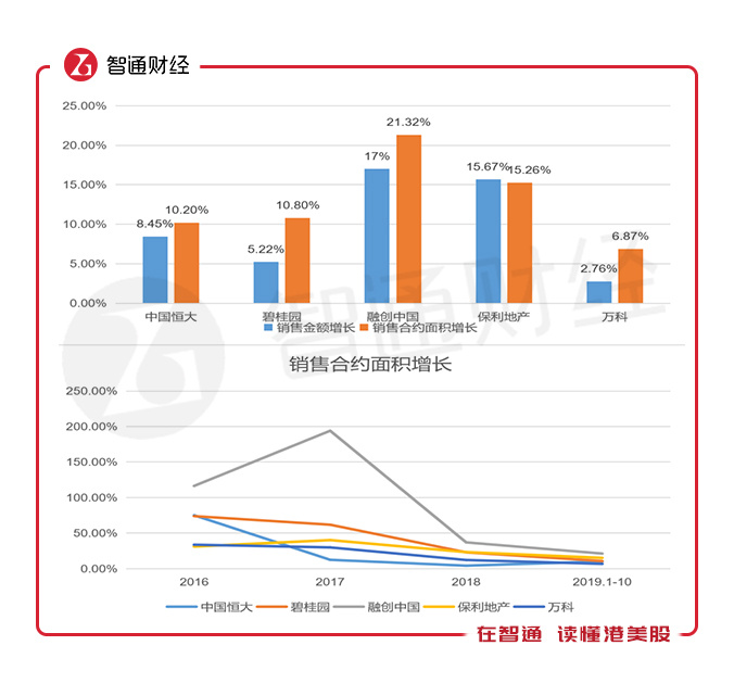 不过从历年的数据中,不难发现,地产行业的发展正在逐步放缓,上述五家销售合约面积增长逐步趋于一致,其中融创以及碧桂园从高速增长逐步回落。