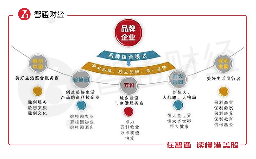 五大龙头地产商品牌打造的理念不一,比如融创中国理念是打造美好生活的综合服务商,旗下有融创服务品牌、融创文旅品牌以及融创文化品牌等,碧桂园则是以创造美好生活产品的高科技企业,旗下包括碧桂园农业、物业以及酒店等品牌,而恒大以大战略、大格局碾压同行,旗下有文旅品牌以及健康品牌等。