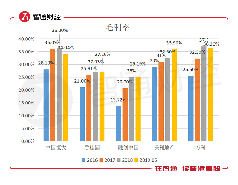 品牌布局需要投入,但项目的盈利水平有一定的差异,从五大龙头企业的历年财务数据看,这几年毛利率水平都有显著性提升,且有逐步趋于一致的趋势。2018年较2016年,恒大毛利提升8.1个百分点,碧桂园提升5.97个百分点,融创提升11.28个百分点,保利地产提升3.5个百分点以及万科提升11.5个百分点。