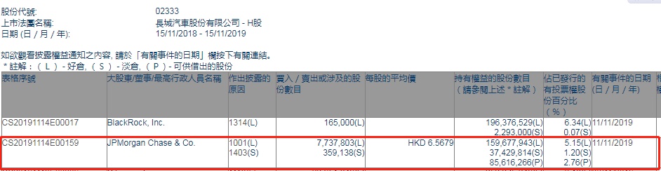 智通财经APP获悉,联交所最新资料显示,11月11日,摩根大通增持长城汽车(02333)773.7803万股,每股作价6.5679港元,总金额约为5082.11万港元。增持后最新持股数目为2453.54万股,最新持股比例为5.15%。