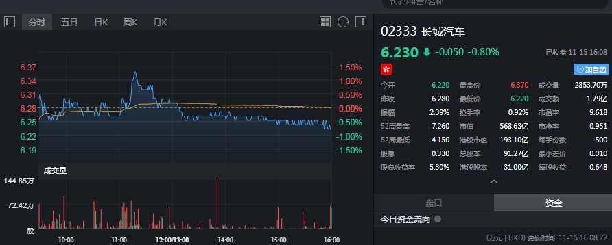 截至今日收盘,长城汽车跌0.80%,报6.23港元。