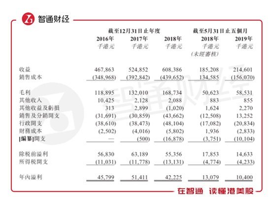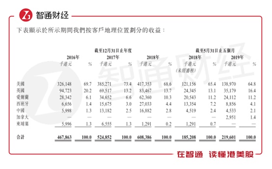 前五大客户贡献近乎全部的营收,其中又以前两大客户比例尤为突出。智通财经APP了解到,在2016-2018年度及2019年前五月期间,公司前五大客户贡献收入为4.59亿港元(单位下同)、5.1亿元、5.94亿元及2.12亿元,营收占比分别高达98.0%、97.0%、97.6%及98.8%。