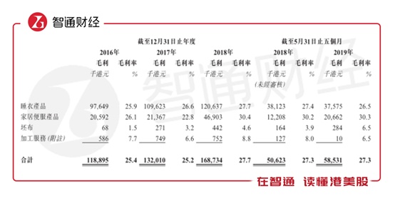 期间公司毛利分别录得1.19亿元、1.32亿元、1.69亿元及5853万元,整体毛利率分别约为25.4%、25.2%、27.7%及27.3%。其中2019年前五月除了睡衣产品毛利率,同比小幅下滑0.9个百分点至26.5%之外,家居便服、坯布以及加工服务毛利都有所上升,因此27.3%的整体毛利率水平较去年同期是持平的。