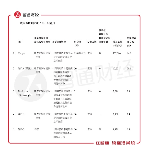 其中总部设于美国的百货公司零售商,已于纽约证券交易所上市为最大客户,期内贡献营收占总比重分别为69.3%、72.9%、67.8%及64.0%;总部设于爱尔兰的跨国时装零售商,并为于伦敦证券交易所上市的为第二大客户,期内贡献营收占总比重分别为22.4%、19.0%、26.2%及29.1%,前两大客户营收贡献占比稳定超过90%。