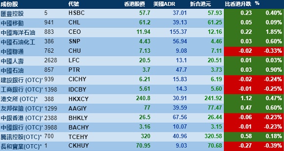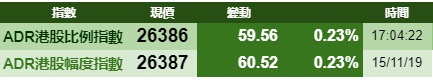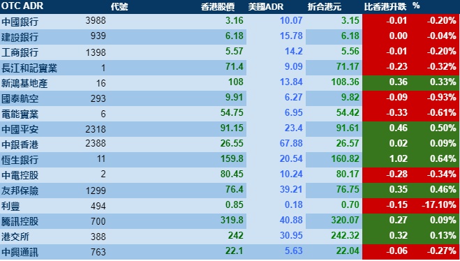 智通财经APP获悉,周五(11月15日)美股小幅上扬,三大股指小幅收涨。港股ADR指数小幅上扬,按比例计算,收报26386点,涨59.56点或0.23%。汇丰控股收报57.93元,较港收市涨0.23元;腾讯控股收报320.58元,较港收市跌0.58元。