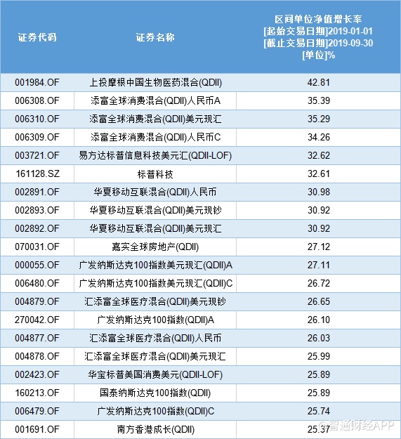 尽管近期港股与美股市场均出现震荡,但在上半年市场涨势强劲的背景下,98%的QDII基金在今年前三季度获得正收益,55%的QDII基金收益率超过双位数,最高收益率高达43%。